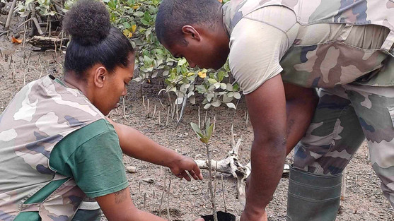 La semaine dernière, les volontaires stagiaires du RSMA de Koumac, spécialisés dans les métiers de la terre, ont eu l’opportunité de collaborer avec les élèves de CM1 et CM2 de l’école de Wanap lors d’une plantation d’arbres autour du parking de l’établissement (arbres offerts par la Province Nord).